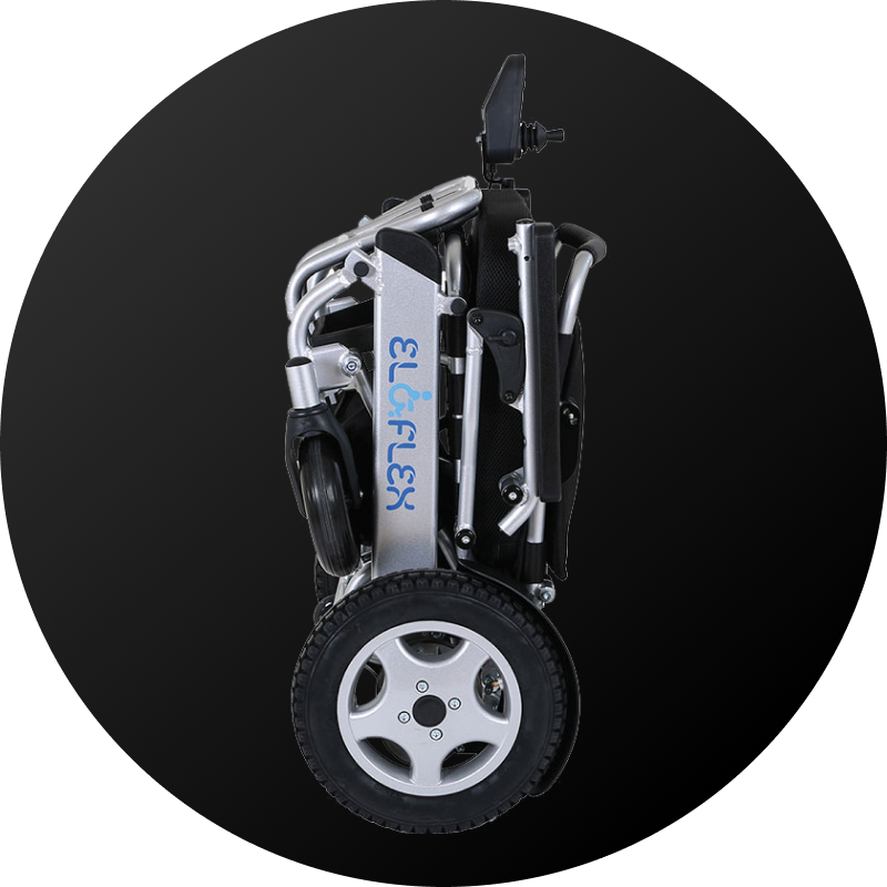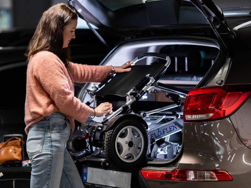 Leyndarmálið liggur í þeirri staðreynd að Eloflex-rafmagnshjólastóll vegur allt að 80% minna en venjulegur rafmagnshjólastóll. Einnig er hægt að fella hann saman með einföldu handtaki og samfellanlegri hreyfingu.