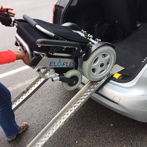 Hleðslurampur er gagnlegt verkfæri til að ferma Eloflex á öruggan hátt í bílinn þinn, sérstaklega ef þér finnst erfitt að lyfta þungum hlutum. Þetta gerir þér kleift að aka Eloflex upp rampinn í samanfellanlegri stöðu með mótorum stólsins. Það eru til margar mismunandi gerðir af römpum: langir, stuttir, breiðir og mjóir... Eloflex býður upp á tvær mismunandi gerðir, sem er að finna í aukahlutum. Á myndinni hér að neðan kynnum við lausn sem einn notenda okkar sendi okkur og virkaði nokkuð vel.