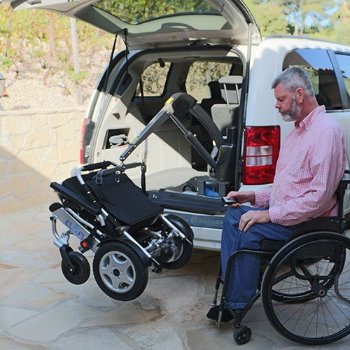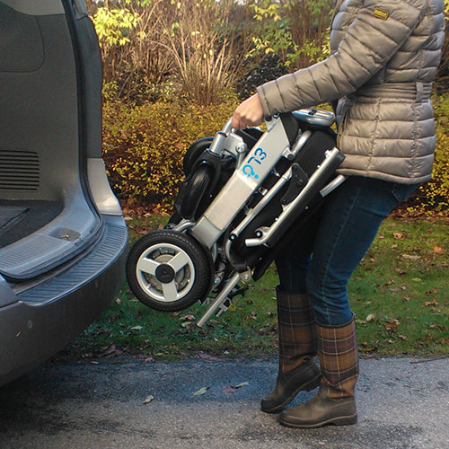 Aðferð með lægra gripi fyrir lágvaxnara fólk. Nýttu hjólin til að rúlla stólnum í skottið á bílnum. Aftengja þarf mótorana áður en þetta er gert.