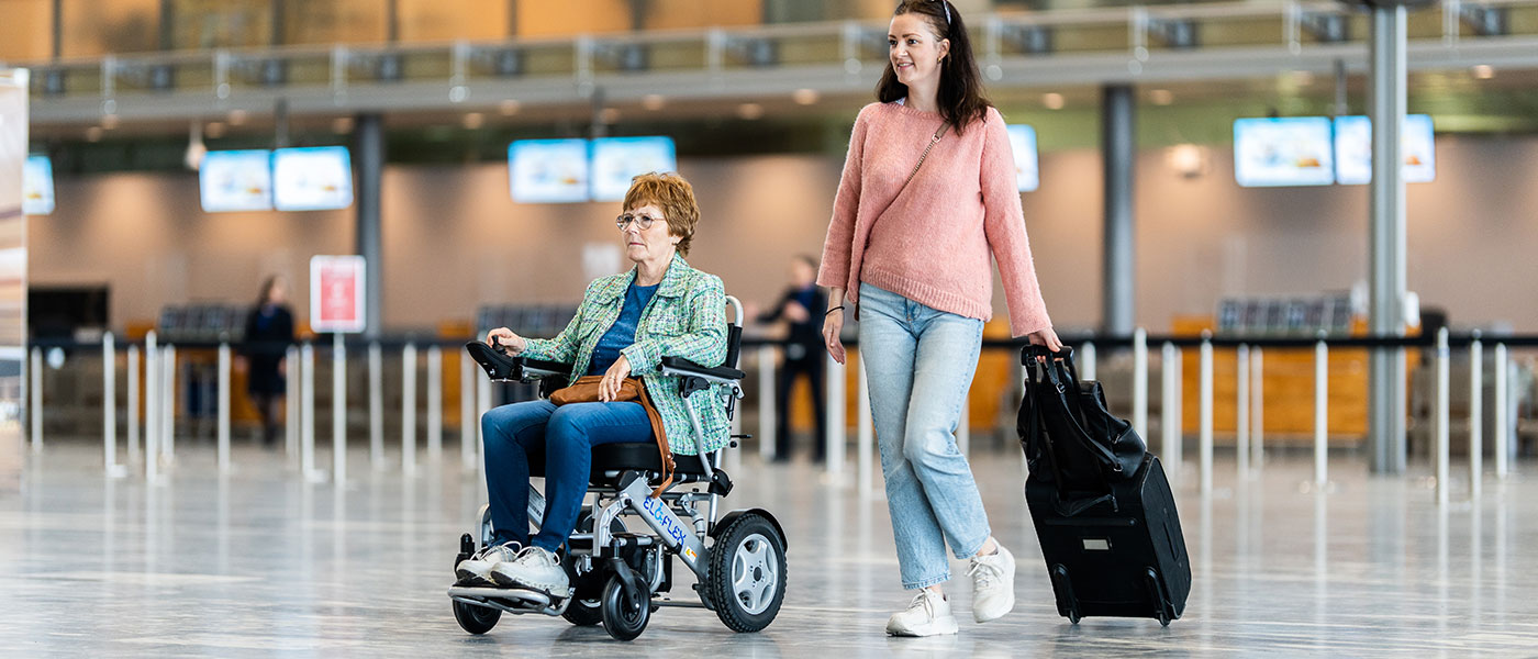 Þegar þú bókar ferðina skaltu gæta þess að taka fram að þú viljir taka með þér rafmagnshjólastól í flugið. Þú færð síðan nokkrar spurningar í framhaldi af því frá flugfélaginu, þar á meðal upplýsingar um þyngd og stærð rafmagnshjólastólsins, gerð, þyngd og afköst rafhlaðnanna. Þú getur fundið svör við þessum spurningum í skjölunum hér að neðan. Við komu á flugvöllinn skaltu halda á hefðbundna innritunarborðið. Það verður haft við flugvallarþjónustuna til að útvega þér handstýrðan hjólastól til notkunar á flugvellinum. Eftir innritun skaltu fara með Eloflex-stólinn þinn á farangursafgreiðslusvæðið þar sem starfsmenn munu sjá um flutning rafmagnshjólastólsins í flugvélina. Ef þú ert ekki með hlífðartösku mælum við með að þú leigir slíka á flugvellinum.