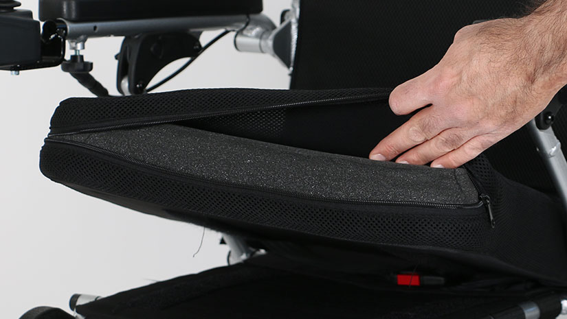 Til að auka hreinlæti má taka bakhlífina og púðaverið af og setja í þvottavél. Undir sætinu er að finna poka sem hægt er að taka af og geyma hluti í á meðan stólnum er ekið. Auðvelt er að þrífa hann með rökum klút.