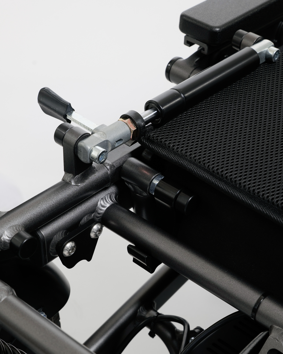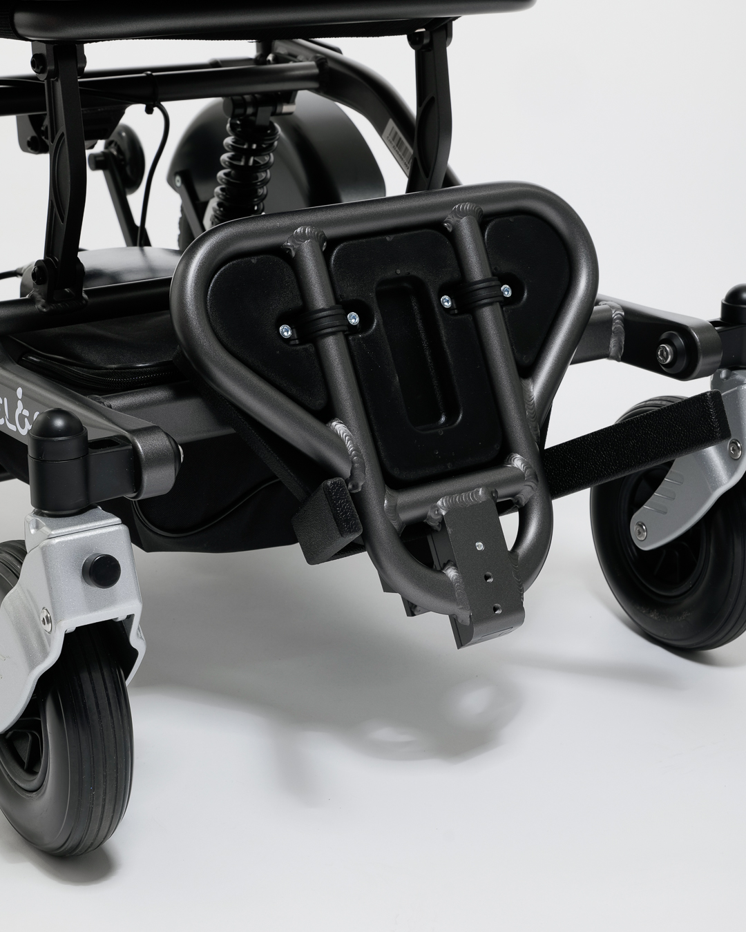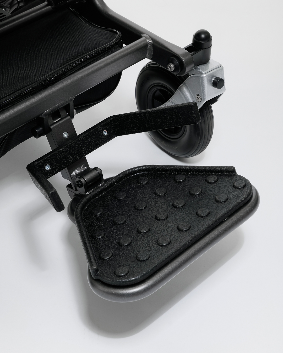 Hægt er að aðlaga armlækka og fótarúllur, sem veitir sérsniðna passun og eykur enn frekar á þægindi. Með þremur rafhlöðuhólfum býður þessi útgáfa upp á lengri notkun fyrir lengri ferðir. Þegar hún er samanbrúnin heldur öryggislás tryggilega hjólastólinn í samanbrúnum stöðu sem auðveldar flutning og geymslu.
