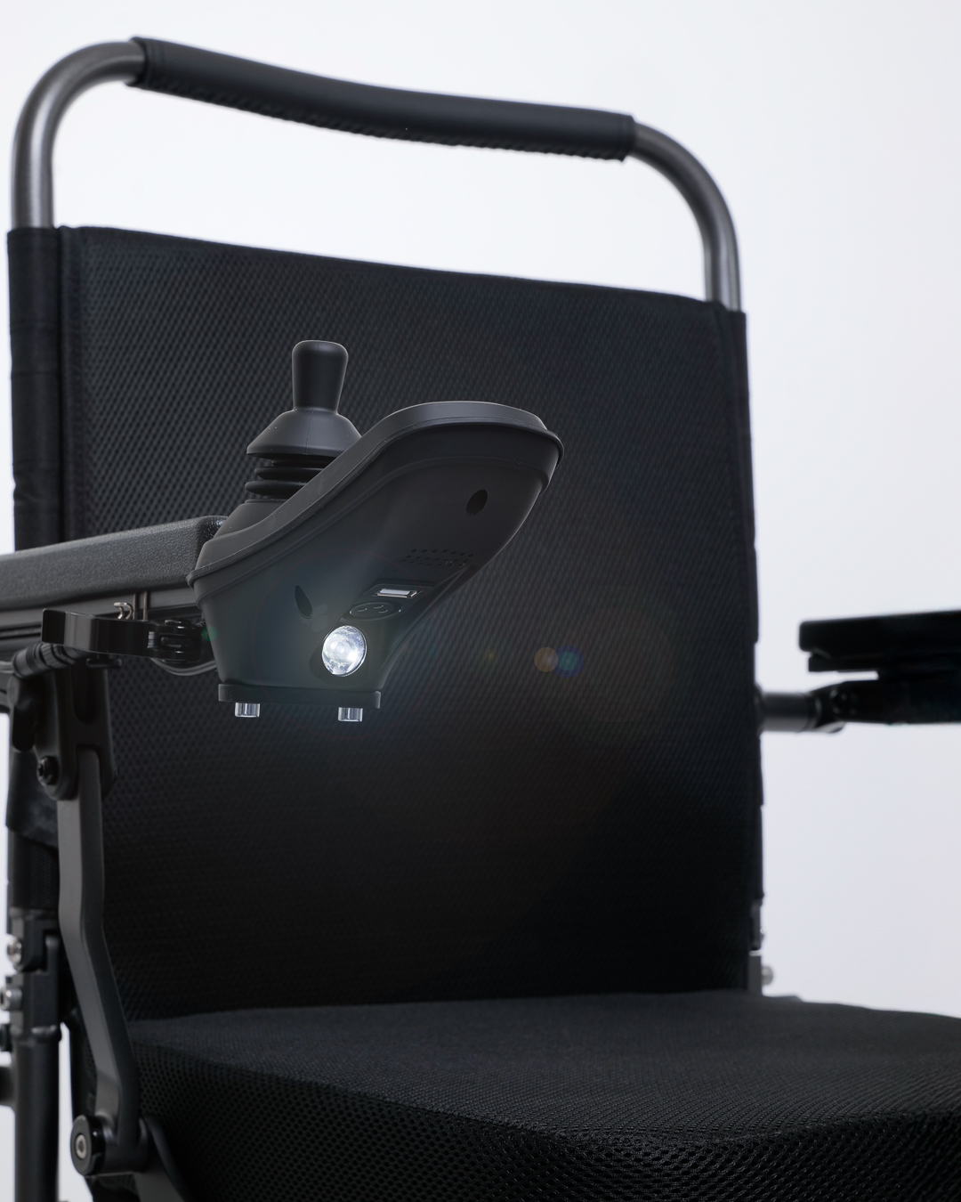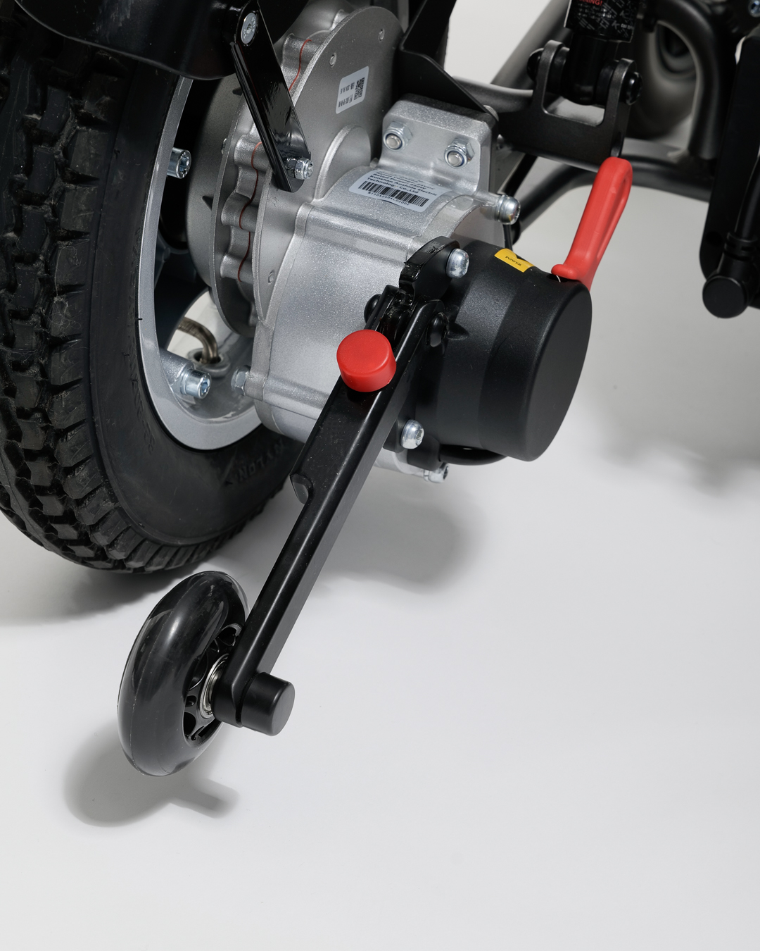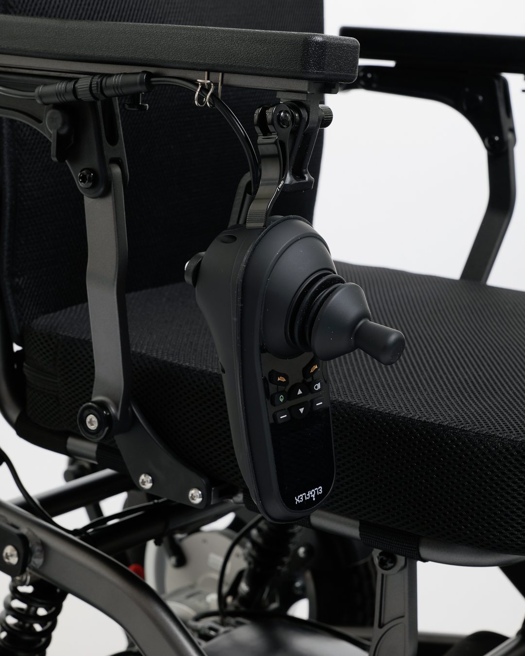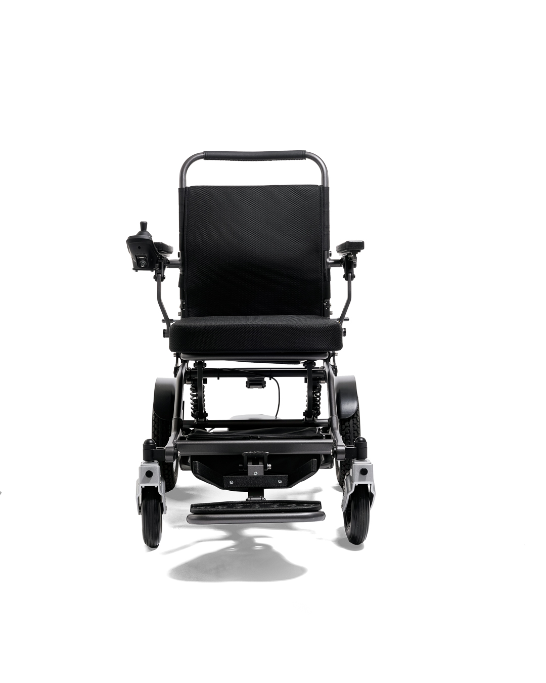 Hægt er að aðlaga armlækka og fótarúllur, sem veitir sérsniðna passun og eykur enn frekar á þægindi. Með þremur rafhlöðuhólfum býður þessi útgáfa upp á lengri notkun fyrir lengri ferðir. Þegar hún er samanbrúnin heldur öryggislás tryggilega hjólastólinn í samanbrúnum stöðu sem auðveldar flutning og geymslu.